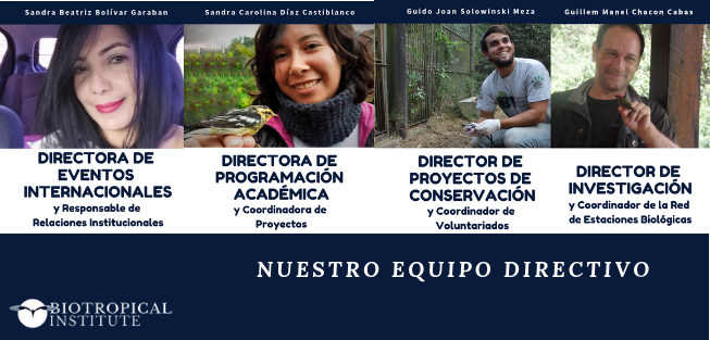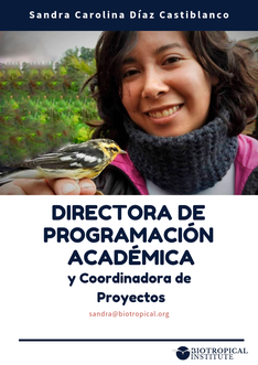 [Colombia] Bióloga egresada de la Universidad Militar Nueva Granada. Ha desarrollado diferentes proyectos en Ornitología y Mastozoología. Con experiencia en ornitología y anillamiento en diferentes continentes. Hace parte de Biotropical desde el año 2016. Coordinadora de América central y sur ha coordinado alrededor de 50 cursos en varios países del continente.